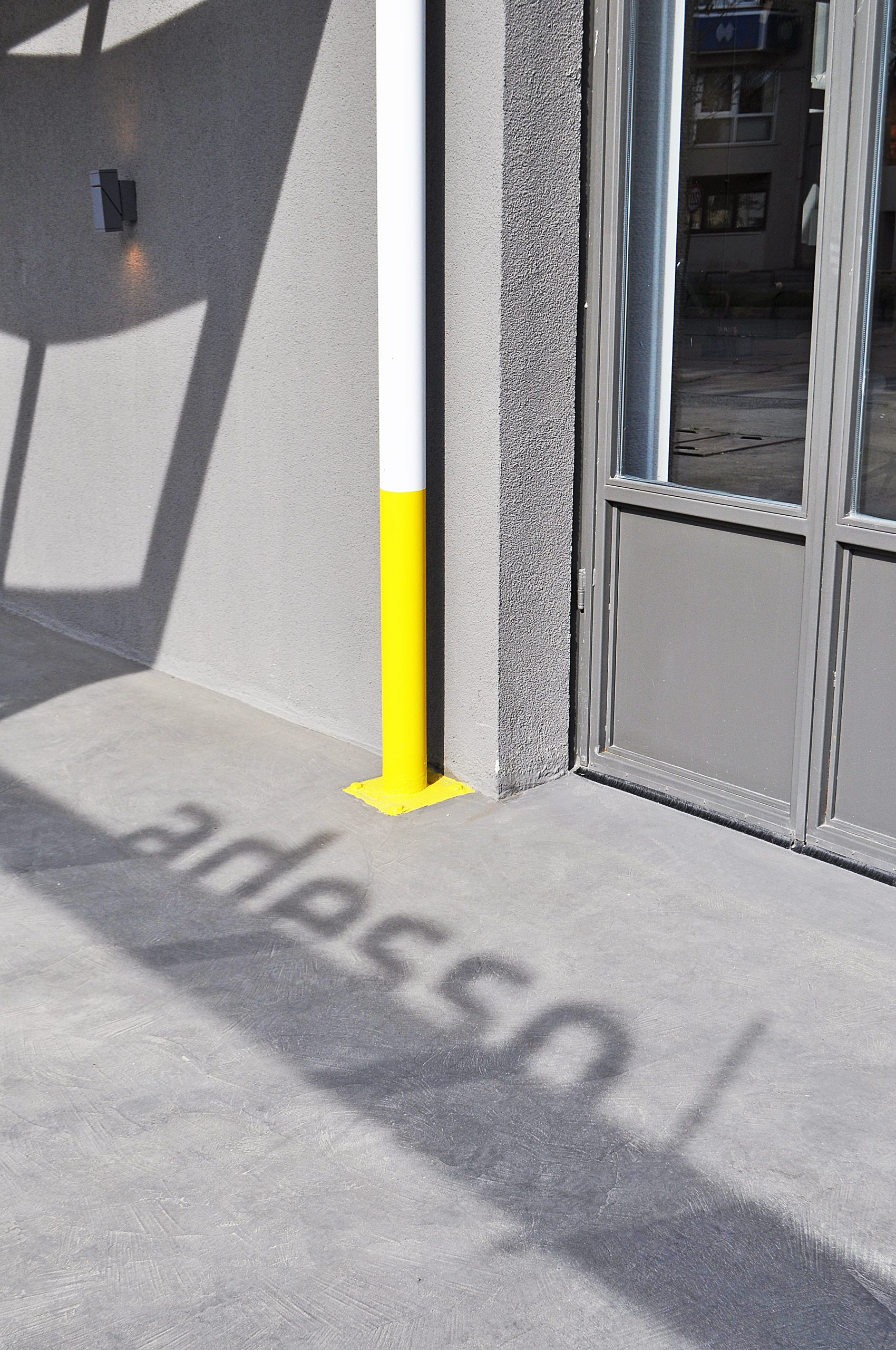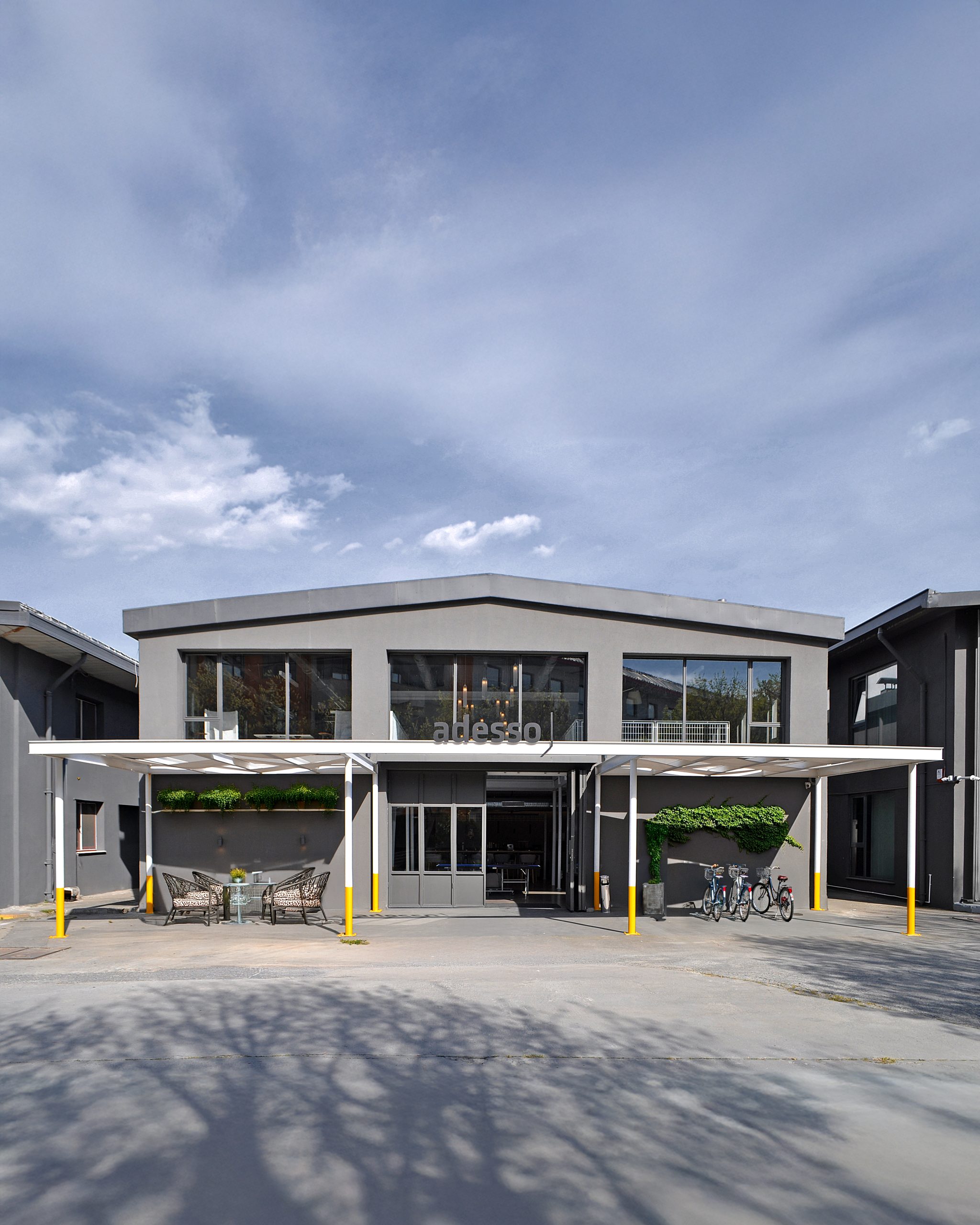 The architectural intervention begins at the facade, where the industrial identity of the building is retained and reinterpreted. A new entrance establishes a clear and welcoming threshold, leading directly into the open-plan interior. The original hangar door was replaced with a foldable steel-framed glass system, allowing the interior to fully open toward the exterior. When opened, the inner court—surrounded by a U-shaped mezzanine—becomes an extension of the public realm and functions as a flexible event space.