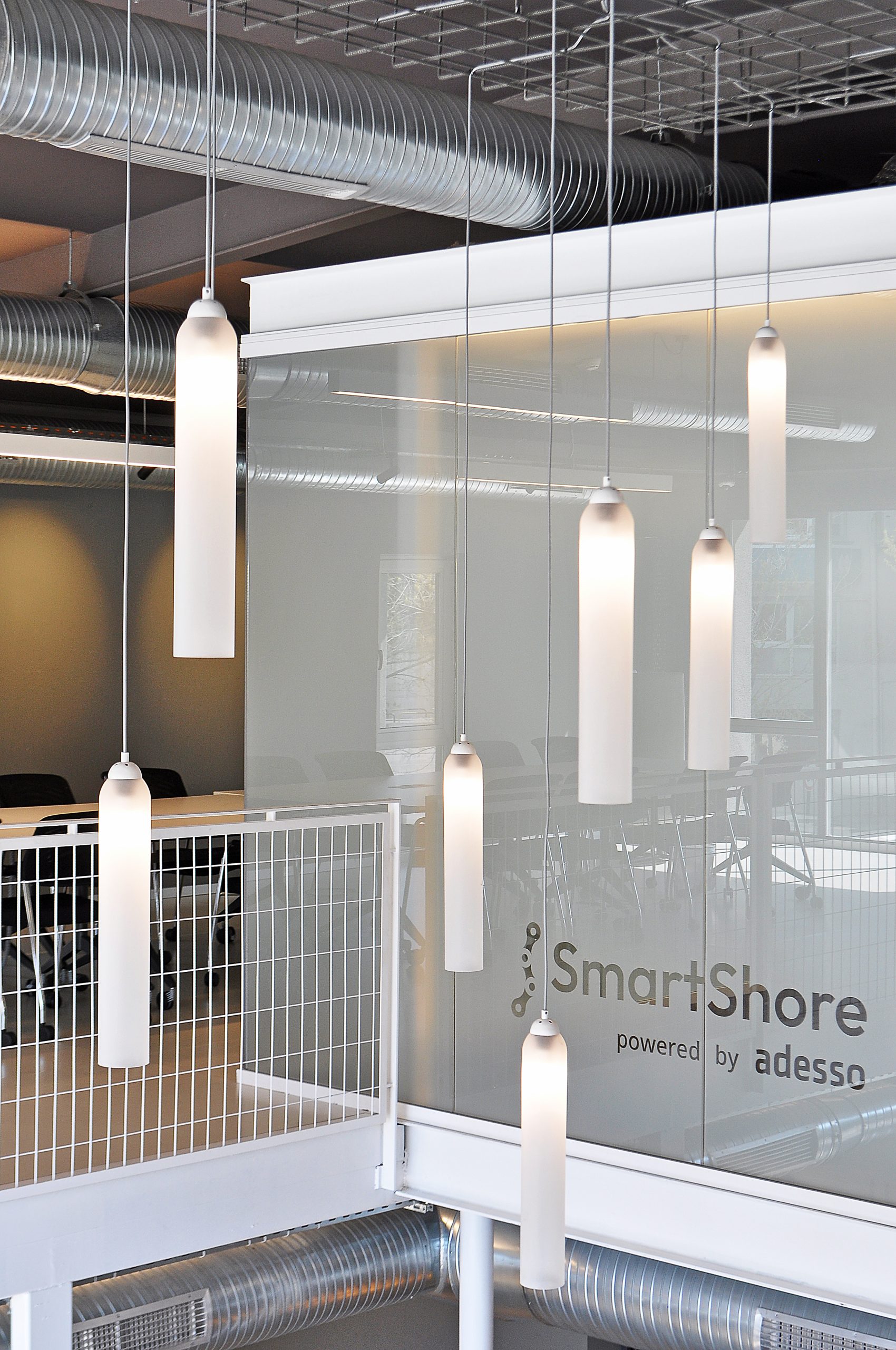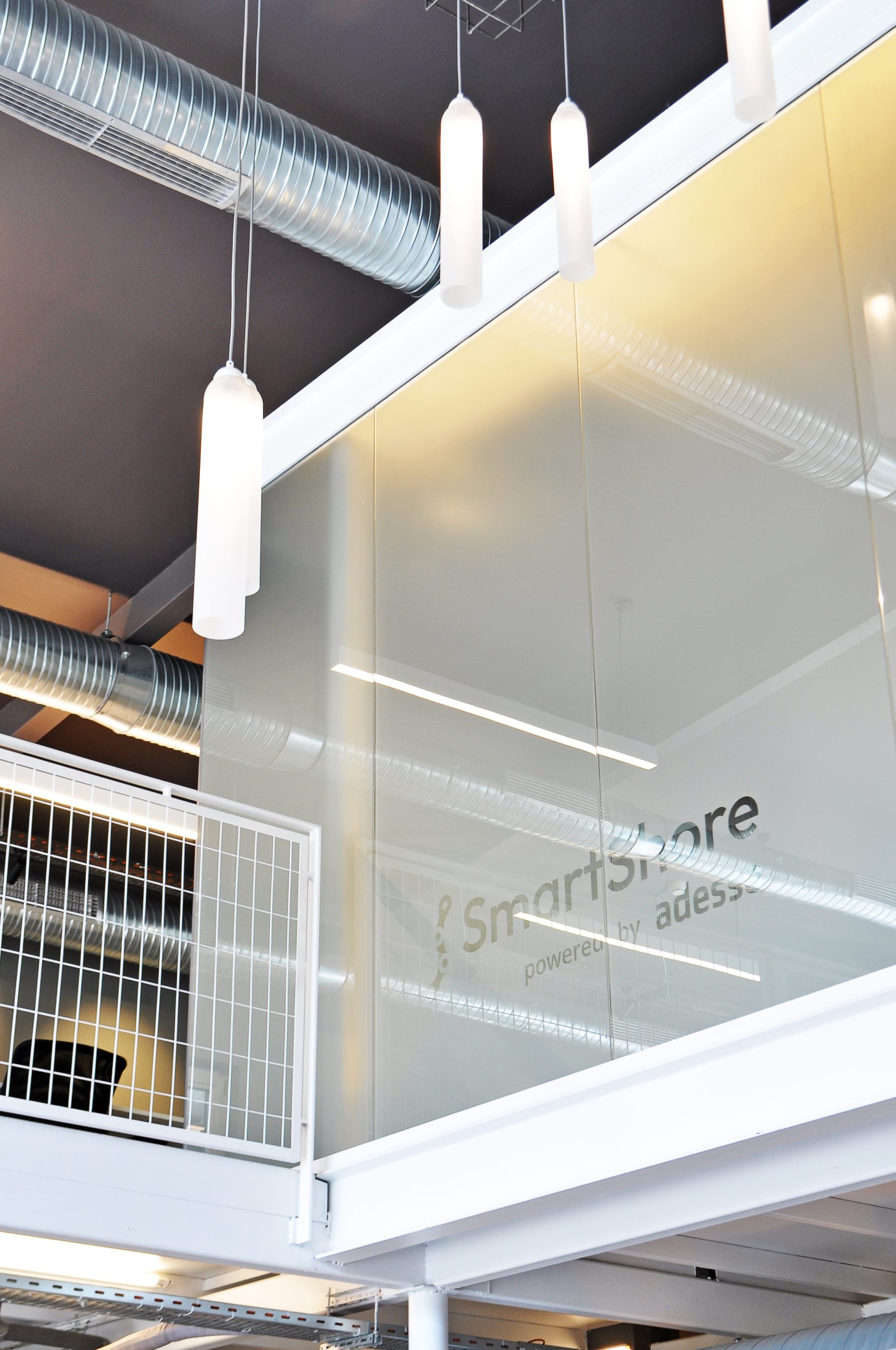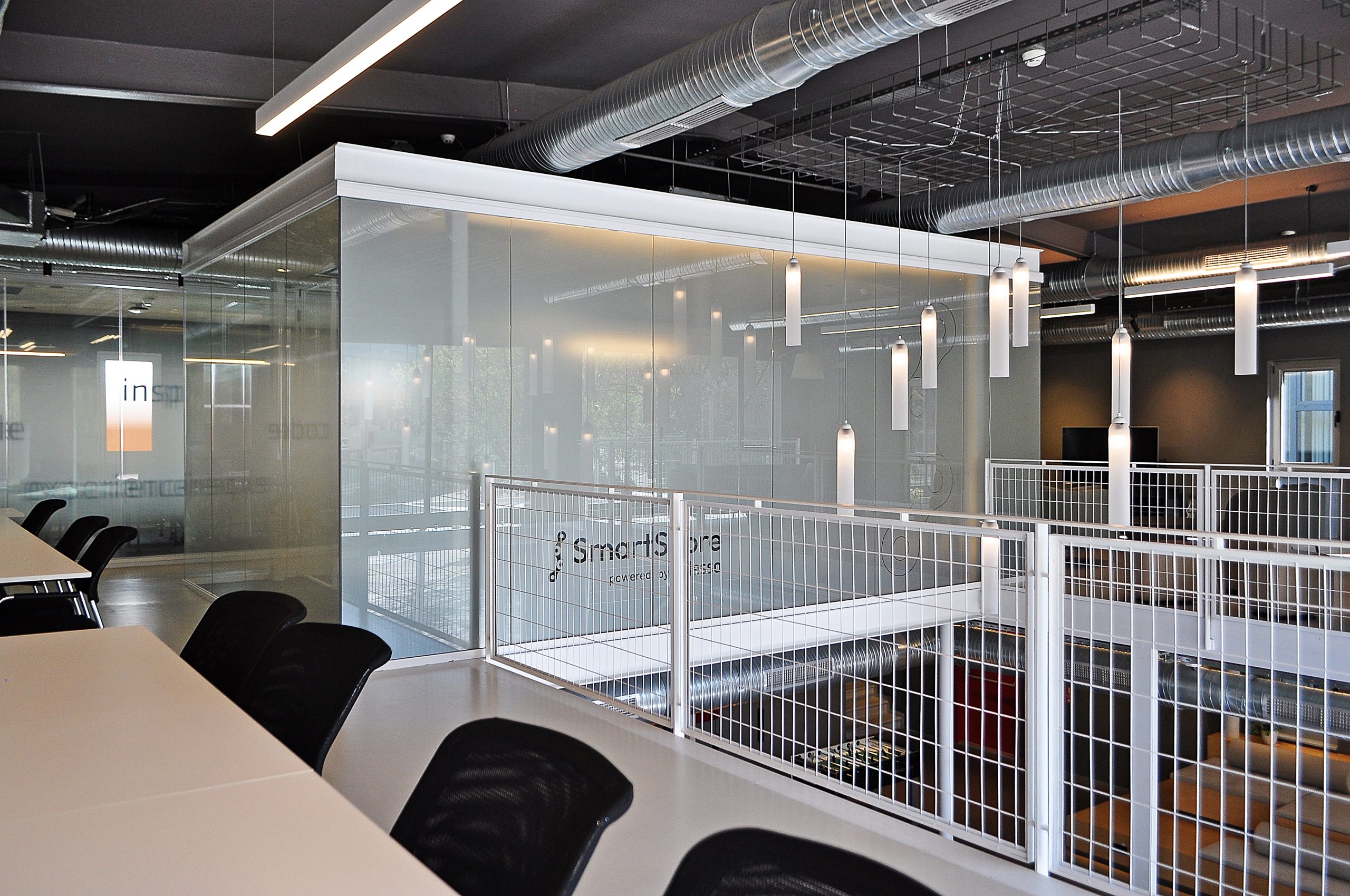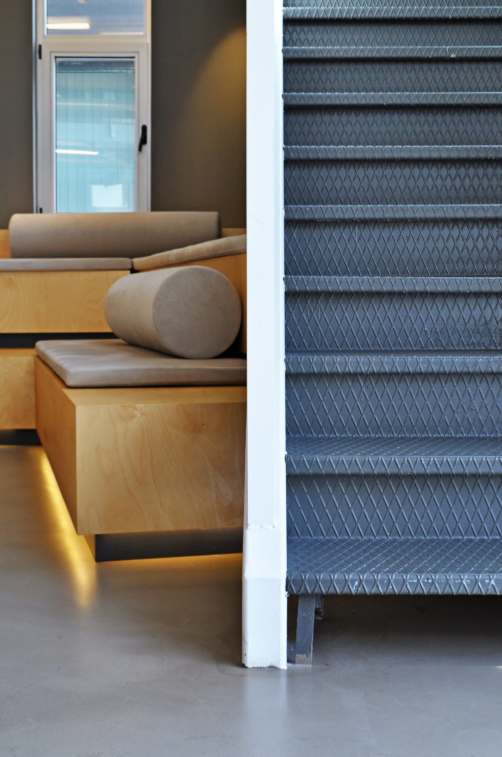 The interior is organized across two levels: the entrance floor and a mezzanine level. Existing gypsum board partitions on the mezzanine were removed to enhance openness and daylight penetration. The original steel structure was preserved and left exposed, reinforcing the industrial character of the space. New steel railings and a glass-enclosed meeting box were introduced above the inner court, providing functional separation while maintaining visual continuity.